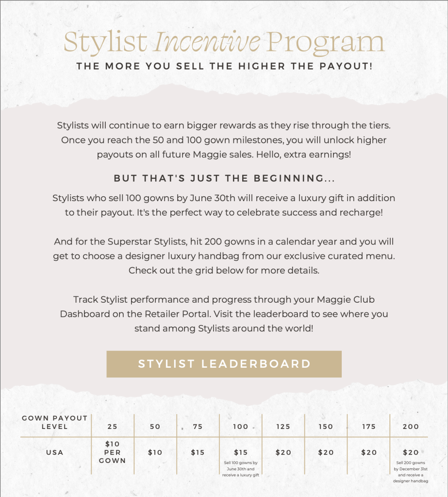 All sales and special orders from the designers listed above qualify for a $50 incentive per gown.